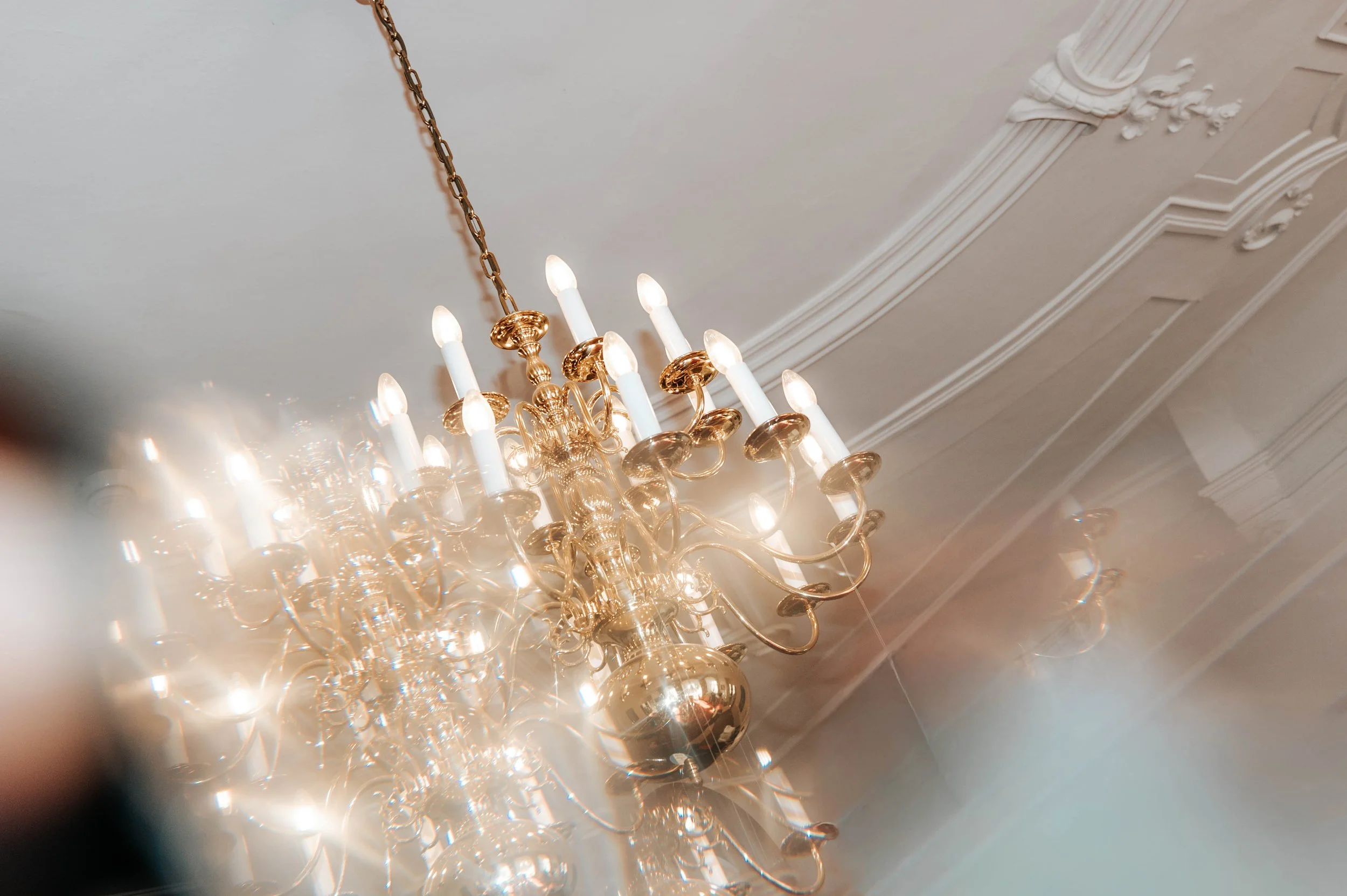 Ein goldener Kristall-Kronleuchter mit brennenden Kerzen, aufgehängt an einer Kette, in einem eleganten Raum mit weißen Deckenstuck.