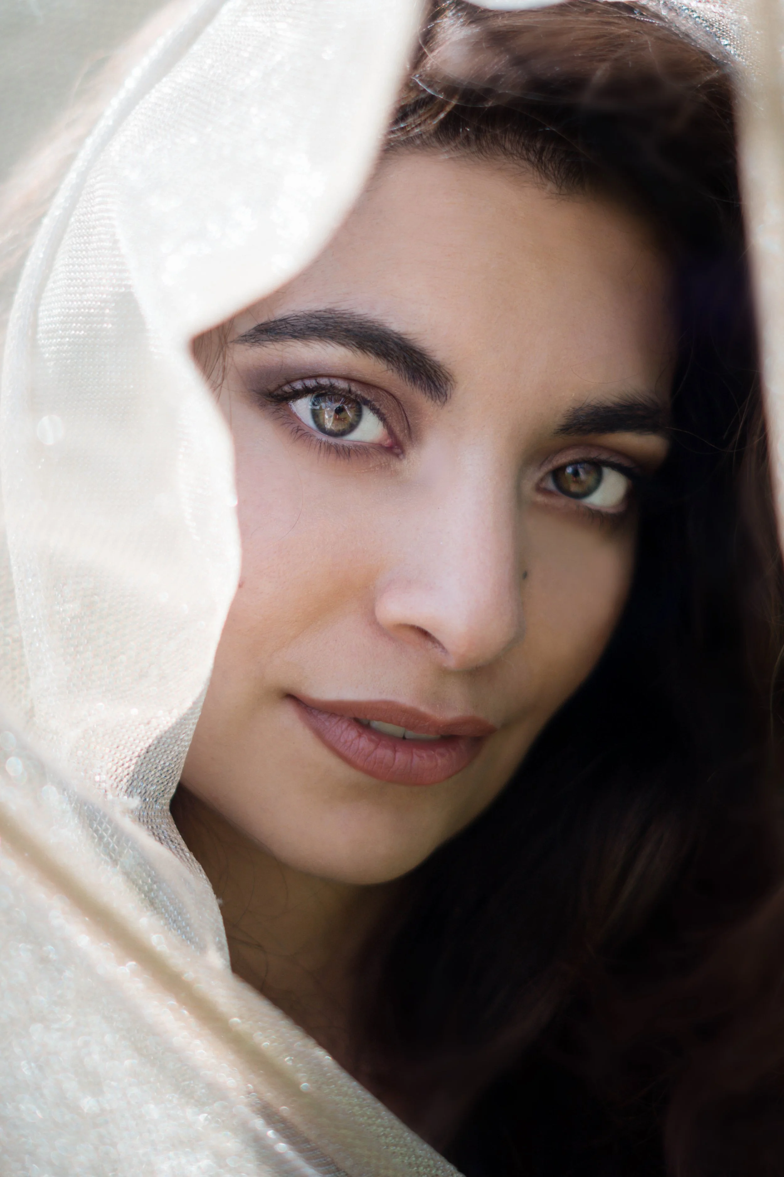 Nahaufnahme eines Frauen Gesichts mit grünen Augen, umgeben von einem weißen, schimmernden Schleier.